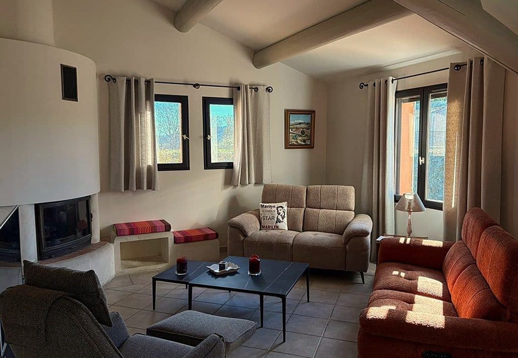 Bright ground floor living room with air conditioning, two adjustable sofas, armchair, banquette for two, internet TV (some foreign language channels) and fireplace. Dining area with table, four chairs and two benches.