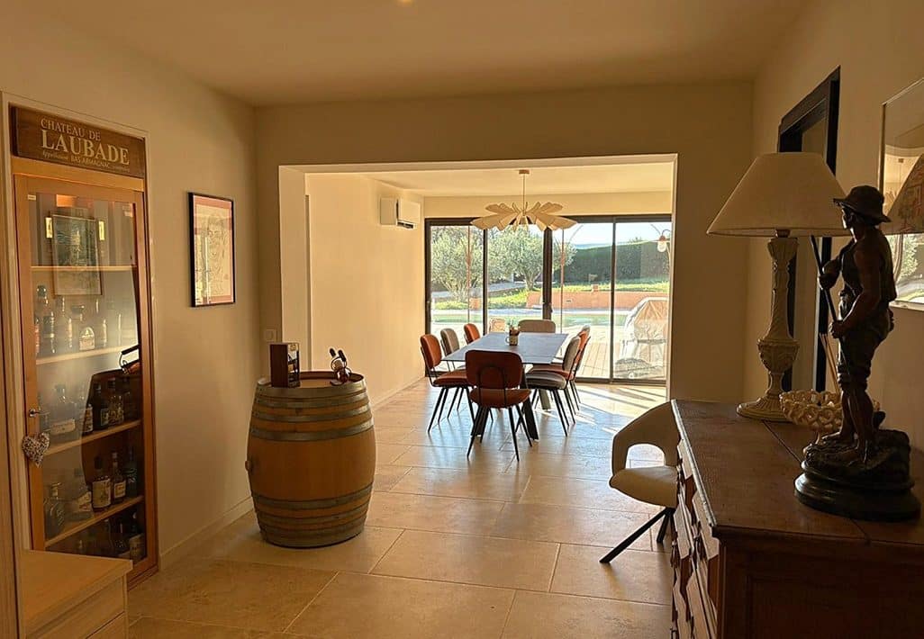 Separate dining room with table and chairs for eight people. Doors leading to terrace, pool and garden.