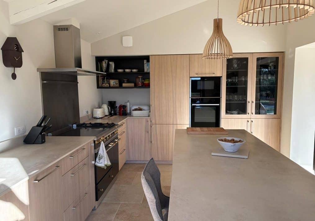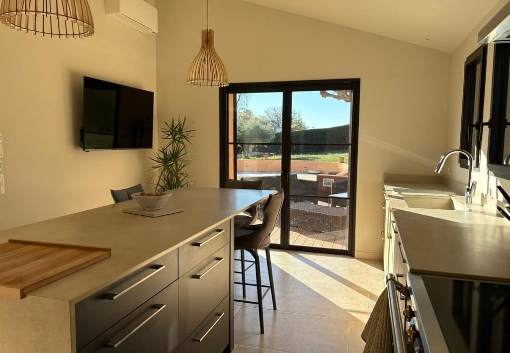 Ground floor kitchen with air conditioning, island with three bar stools, dishwasher, oven, microwave, Lacanche cooker with half induction hotplates and half gas, American fridge/freezer, kettle, coffee machine (Nespresso) and filter coffee machine, toaster and TV. Doors leading to terrace, pool and garden.