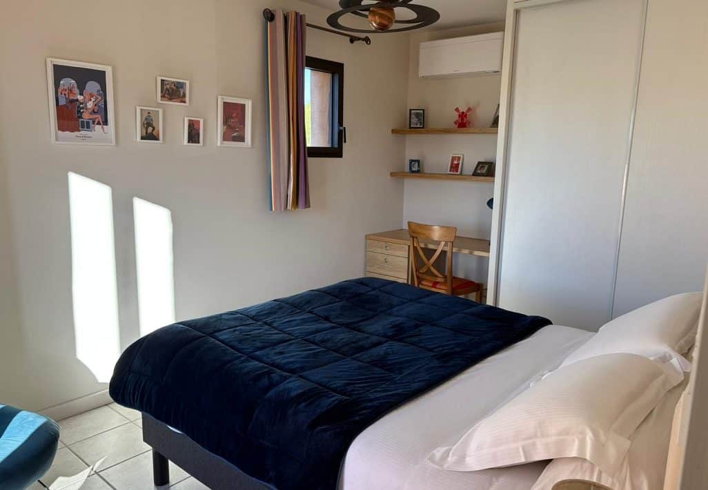 Bedroom 3: Bedroom with Queen size bed (160cm x 200cm), desk, chair and door to small terrace with table and two chairs.